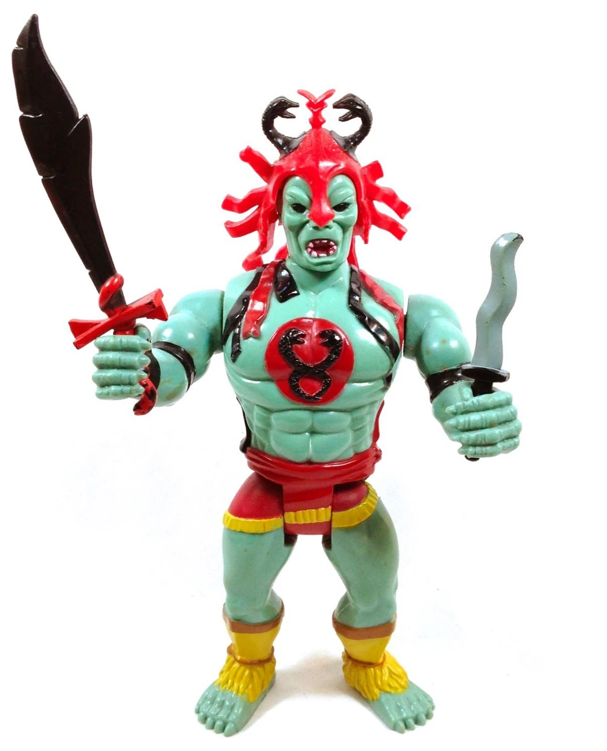 1. Sword: Made of black plastic and the handle painted red, the sword was designed to fit into the figure's right hand. This sword bears similarity to the Sword of Plun-Darr which appears in some of the ThunderCats cartoons.
