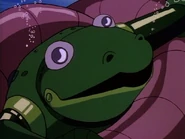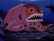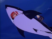 Meanwhile at the Great Oceanic Plug, Dr. Dometone's crew have depleted all of their food supplies. Not knowing when the doctor will return with new supplies, one of the crewman leaves the station in a small propulsion sub. Unfortunately, Scrape who had been lying in wait nearby, attacks the sub with his Giant Electric Eel. He then turns his attention to the plug and slams his eel right into it. At that moment, Dr. Dometone and the three ThunderCats arrive at the scene and Lion-O and WilyKat, armed with neutralizing grounding cable, leave Hercules in Shark Suits. Scrape, having noticed Hercules' arrival, lunges straight at the robot, coiling the eel tightly around it. However, before he can electrocute it, Lion-O casts the grounding cable on the eel, neutralizing its charge and disabling it.