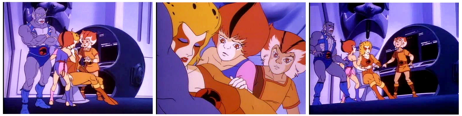 Back inside the lair, the ThunderCats are still trying to figure out who or what Grune is. Even the Sword of Omens' "Sight Beyond Sight" fails to shed any light on the situation. Not surprising as the sword does not posess any psychic powers, as Tygra points out. Cheetara then reveals that she does possess psychic powers, her Sixth Sense, which allows her to see visions, but harnessing it is very taxing on her, taking her weeks ot even months to recover. But forsaking the risks, she invokes her psychic powers which reveal that Grune was once a ThunderCat and friend of Jaga. Having fought many battles together against enemies of Thundera, Grune was eventually overcome by greed and turned evil. It was thus up to Jaga to defeat Grune and banish him for good. Panthro reckons that Grune's spaceship must have ended up on Third Earth somehow, thus explaining his presence on the planet.