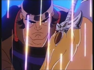 After having a hearty laugh at their childish behavior, both begin to head their separate ways when Hachiman learns the identity of Lion-O. Having found his target, Hachiman challenges Lion-O to a duel but as soon as they start to fight, both the Thunder-Cutter and the Sword of Omens refuse to draw. Both Lion-O and Hachiman realize that the duel is evil, hence the swords refused to draw. Realizing that he had been lied to by Mumm-Ra, Hachiman becomes friends with Lion-O and with one quick slash of his katana chops down a tree to form a new bridge across the Four Day Drop.